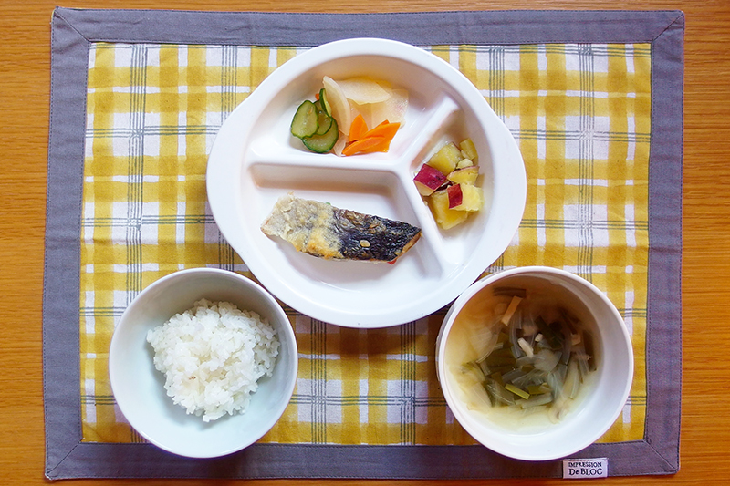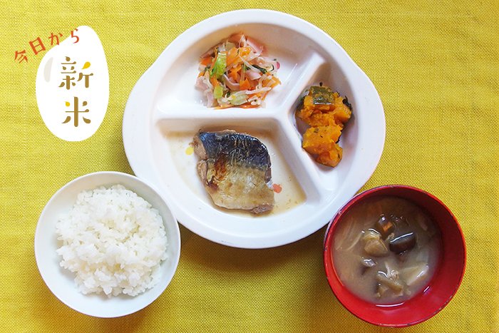 ごはん さばの煮付け かぼちゃのあおさ焼 ハムとチンゲン菜のソテー 白菜のみそ汁 \ 10月8日 /