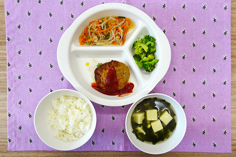 ごはん ハンバーグ ゆでブロッコリー 春雨サラダ 豆腐のスープ \ 10月10日 /