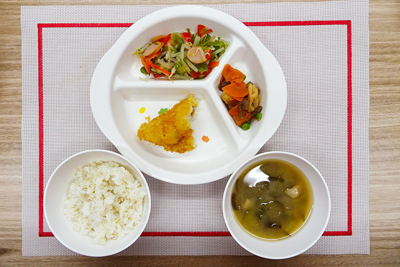 麦入りごはん フィッシュフライ ウインナーと野菜のソテー がんもの煮物 なすびのみそ汁 \ 10月14日 /