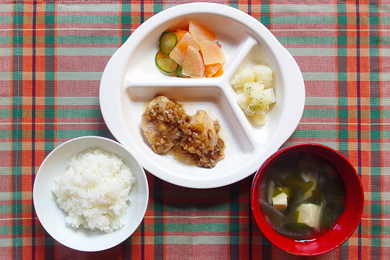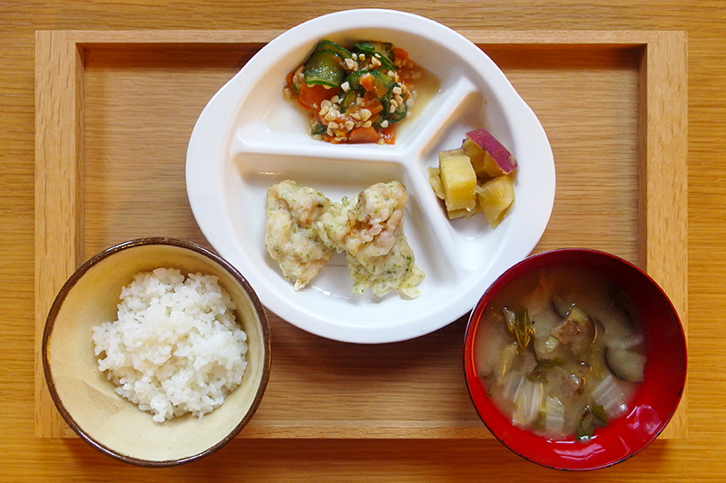 ごはん 鶏肉の磯辺揚げ さつま芋のはちみつ煮 胡瓜の納豆和え チンゲン菜のみそ汁 \ 10月17日 /