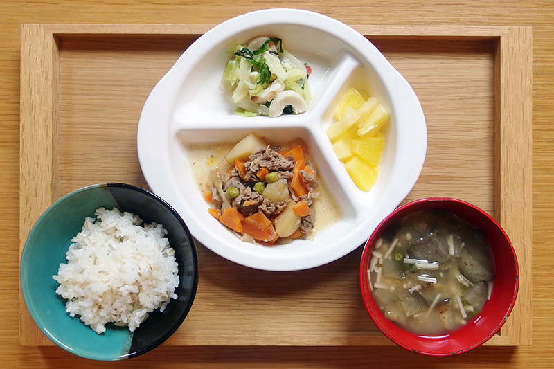 麦入りごはん 肉じゃが ちくわとほうれん草のソテー えのきだけのみそ汁 フルーツ(パイン) \ 10月1日 /