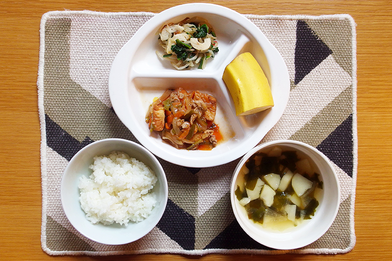ごはん 豚肉と厚揚げのケチャップ炒め ナムル 秋じゃがのスープ フルーツ(バナナ) \ 10月20日 /