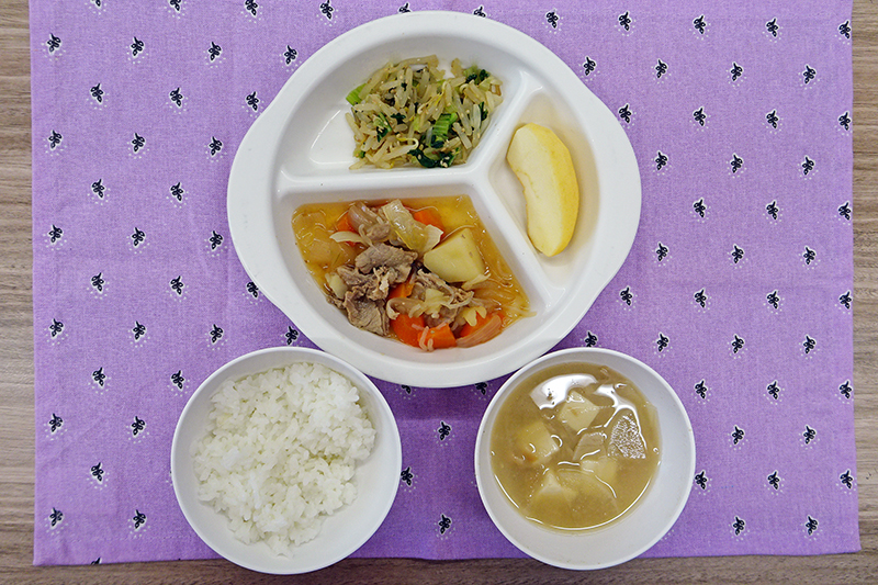 ごはん 豚じゃが チンゲン菜ともやしのごま和え 大根のみそ汁 フルーツ(りんご) \ 10月27日 /