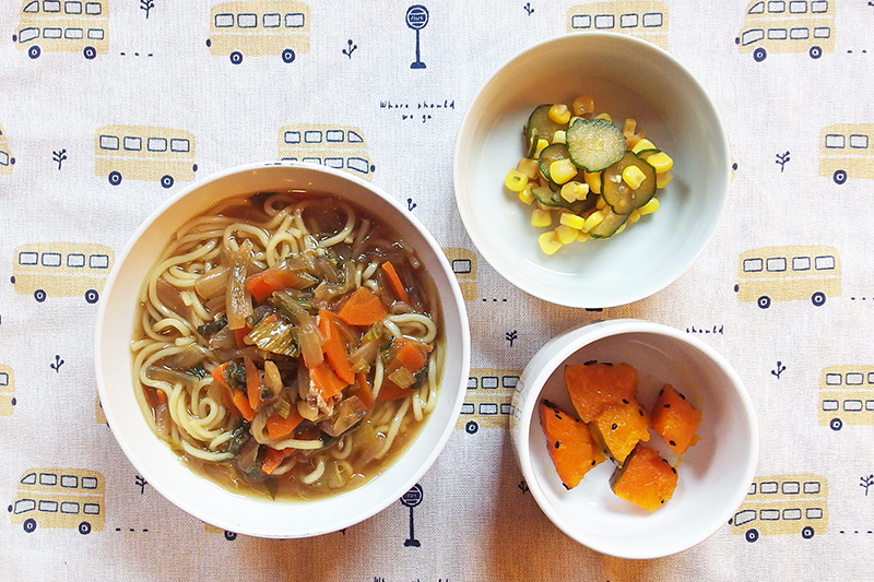 とり醤油ラーメン 胡瓜とコーンのさっぱり和え 大学かぼちゃ \ 10月2日 /