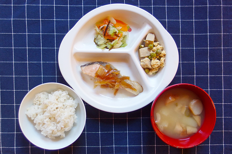 麦入りごはん サケの焼南蛮 キャベツの塩昆布和え 高野豆腐の卵とじ じゃがいものみそ汁 \ 10月3日 /