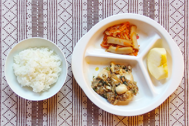 ごはん 秋野菜マーボー(旬メニュー) さつま揚げと切干大根の中華和え フルーツ(りんご) \ 10月6日 /