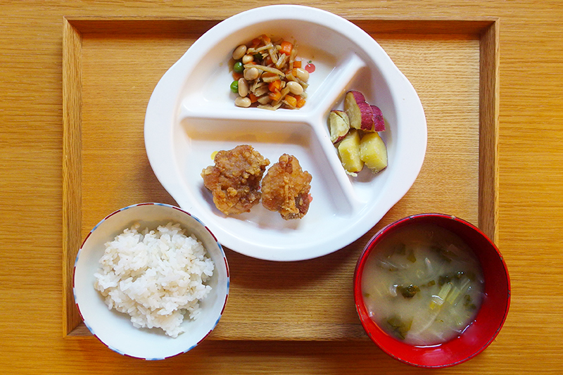 麦入りごはん 鶏肉の唐揚げ 焼さつま芋 煮豆 大根のみそ汁 \ 10月7日 /