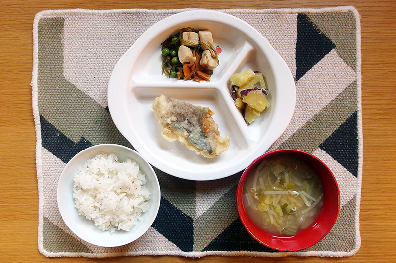 麦入りごはん 白身魚の味付天ぷら 焼さつま芋 高野豆腐と昆布の煮物 白菜のみそ汁 \ 11月7日 /