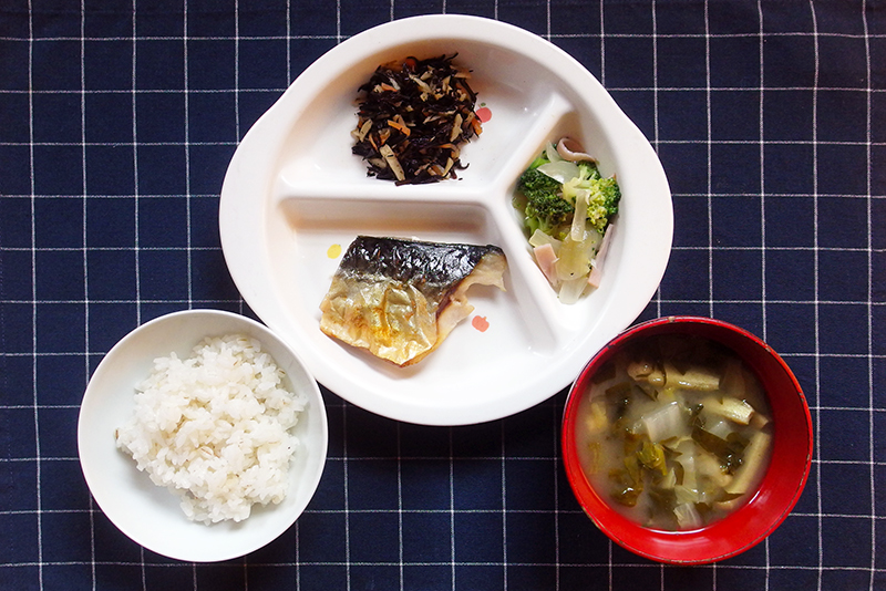 麦入りごはん さばの塩焼 ハムと野菜のソテー ひじき煮(海藻メニュー) ほうれん草のみそ汁 \ 11月12日 /