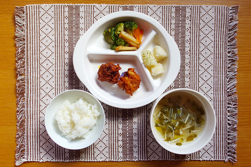 さつま芋ごはん 鶏肉の唐揚げ ゆでブロッコリー ひじき豆(海藻メニュー) 玉ねぎのみそ汁 \ 11月6日 /