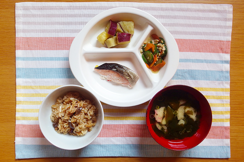 きのこの炊き込みごはん さけの塩焼 さつま芋の甘煮 きゅうりと納豆のネバネバ和え 花麩のすまし汁 \ 11月17日 /