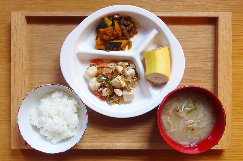 ごはん かみなり豆腐 かぼちゃとこんにゃくの煮物 大根のみそ汁 フルーツ(バナナ) \ 11月18日 /