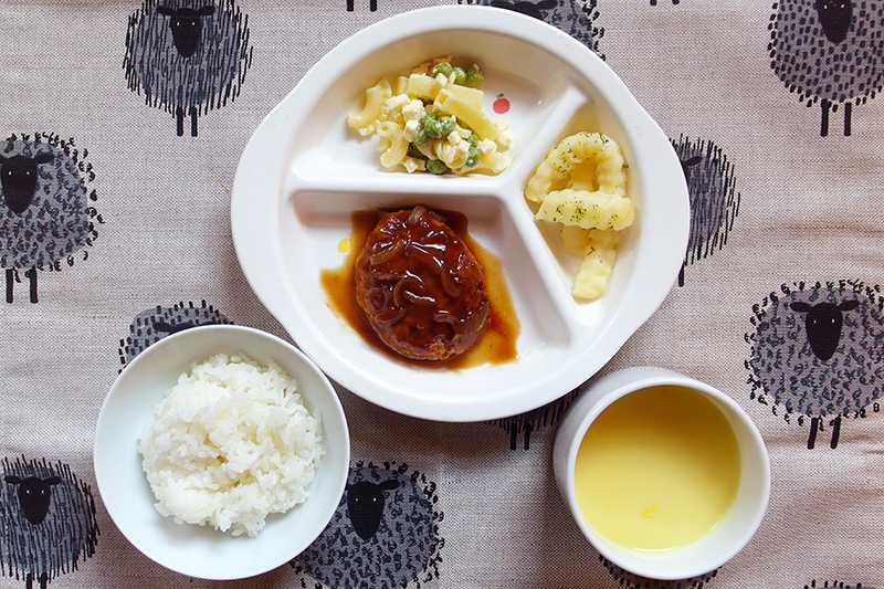 ごはん 煮込みハンバーグ ポテトフライ マカロニサラダ コーンクリームスープ \ 11月21日 /