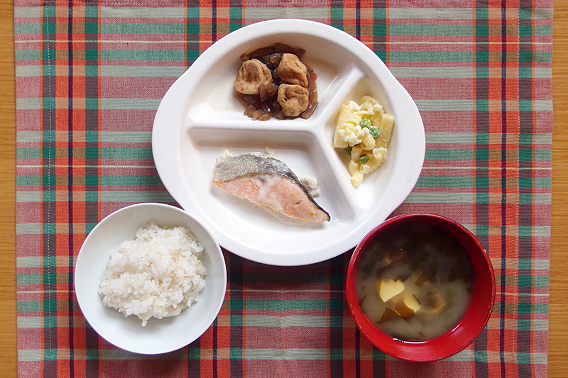 麦入りごはん サケのバターソース マカロニサラダ がんもの煮物 豆腐の味噌汁