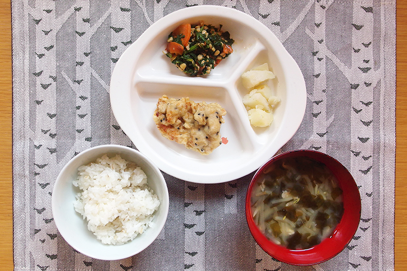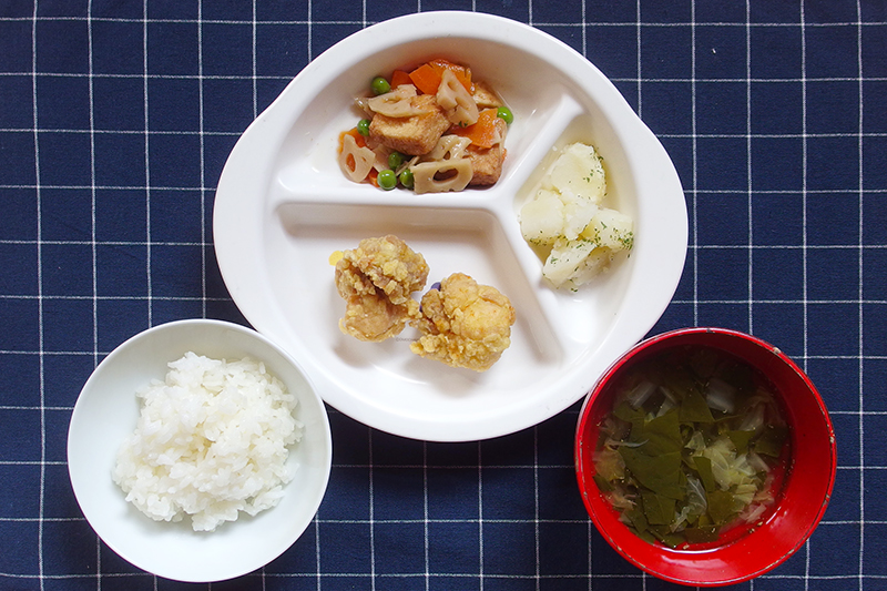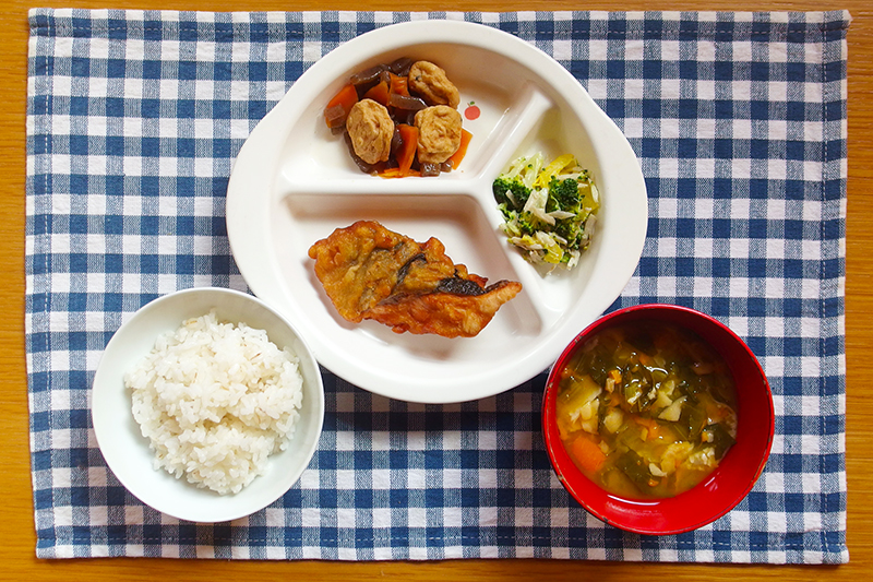 ごはん 鶏肉のカレー風味揚げ 粉ふき芋 厚揚げの煮物 ほうれん草のスープ \ 12月3日 /