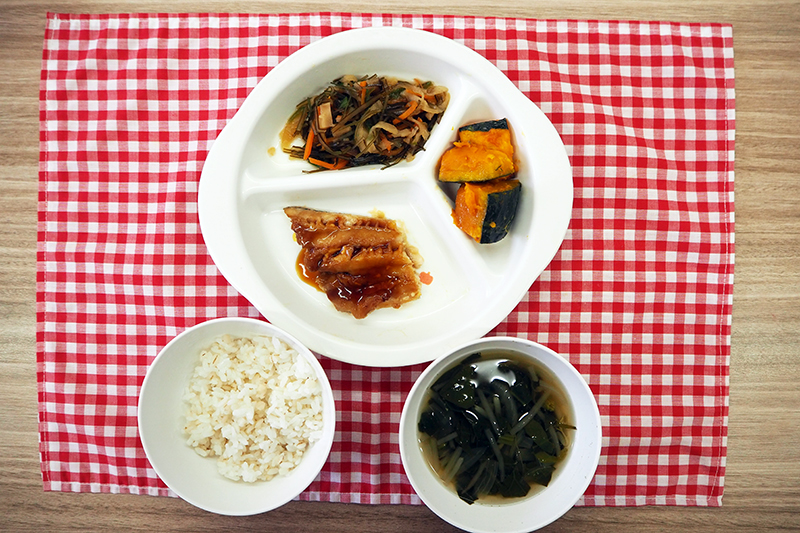 麦入りごはん 白身魚の中華風蒲焼 かぼちゃのバター焼 昆布イリチー(炒め煮)(海藻メニュー) 中華スープ \ 12月9日 /