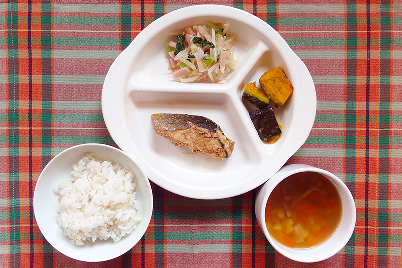 麦入りごはん サケの中華みそ煮 ハムとチンゲン菜のソテー 焼かぼちゃ 中華スープ \ 12月18日 / チキンライス 彩りサラダ コーンクリームスープ \ 12月17日 /