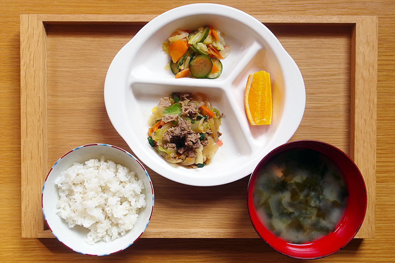 麦入りごはん 牛肉と野菜の五目炒め 白菜と胡瓜の梅風味和え おつゆ麩のみそ汁 フルーツ(オレンジ) \ 12月19日 /