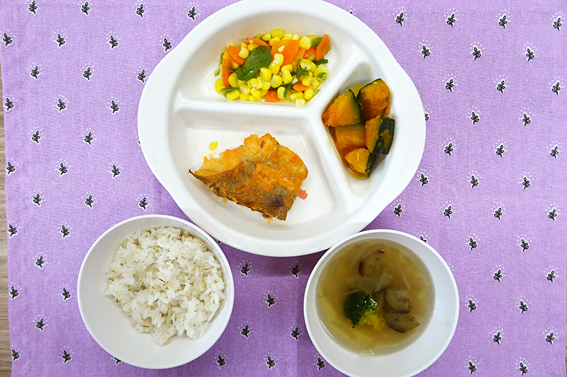 麦入りごはん 白身魚のオーロラ焼 かぼちゃの甘煮 コーンサラダ ブロッコリーのスープ \ 12月23日 /