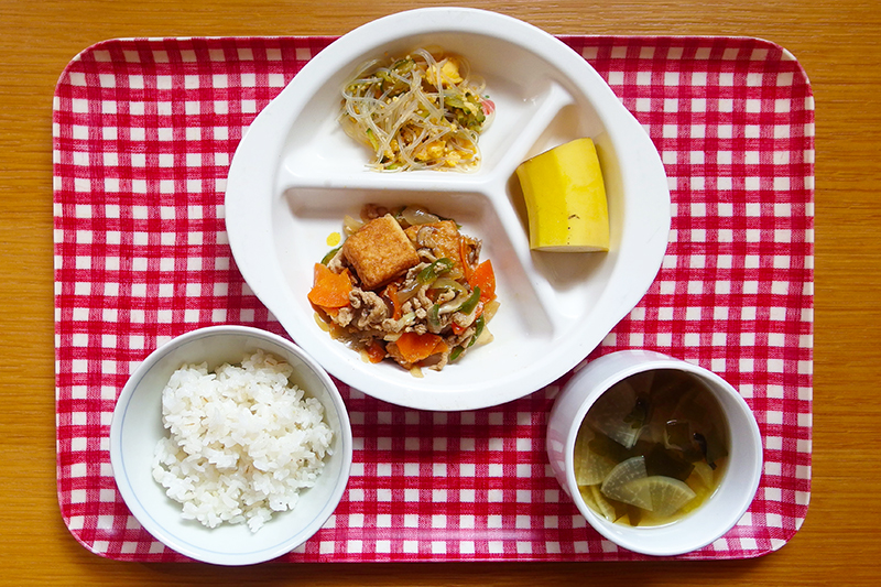 麦入りごはん 家常豆腐(厚揚げと野菜の中華炒め) 拌三絲(中華春雨サラダ) 中華スープ フルーツ(バナナ) \ 12月2日 /