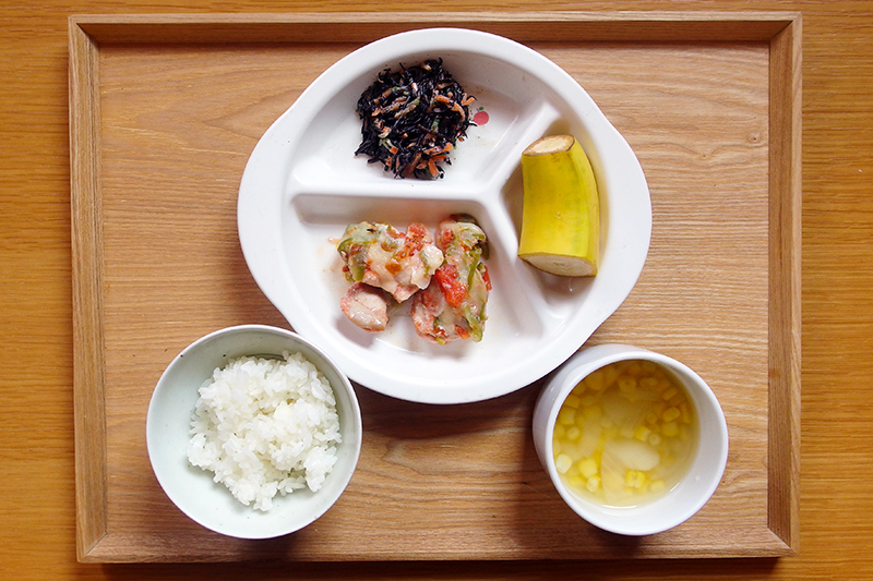 ごはん ピザ風チキン ひじきサラダ じゃがいものスープ フルーツ(バナナ) \ 12月4日 /