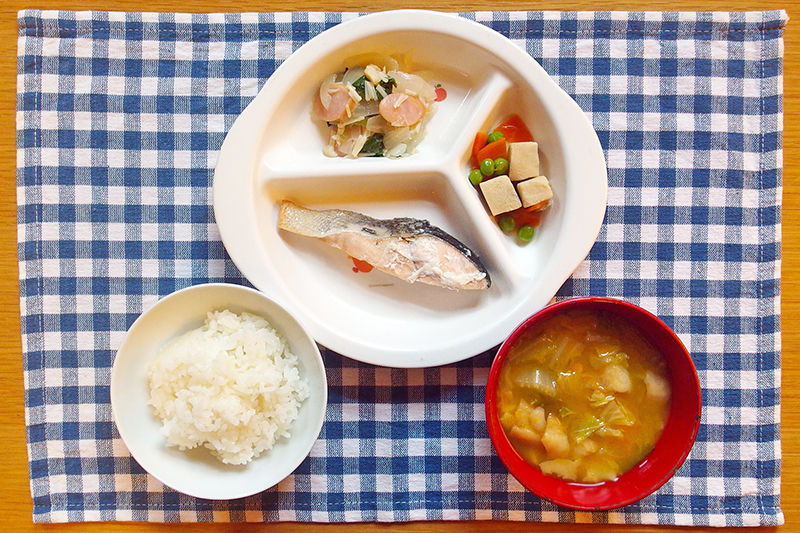 ごはん サケの塩焼 ウインナーとチンゲン菜のソテー 高野豆腐の煮物 かぼちゃのみそ汁 \ 9月9日 /
