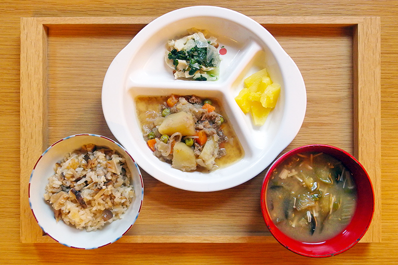 きのこの炊き込みごはん 肉じゃが ちくわとほうれん草のソテー なすの味噌汁 フルーツ(パイン) \ 9月10日 /