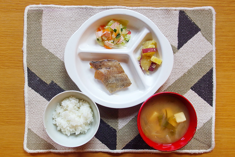 ごはん 白身魚の甘辛煮 ベーコンと野菜のソテー 蒸さつま芋 豆腐のみそ汁 \ 9月11日 /