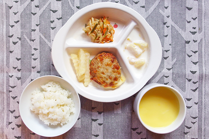 ごはん チーズハンバーグ ポテトフライ 切干大根サラダ コーンクリームスープ フルーツヨーグルト \ 9月12日 /