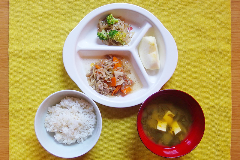 麦入りごはん 豚肉と根菜の煮物 もやしとブロッコリーのしらす和え ほうれん草のみそ汁 フルーツ(りんご) \ 9月16日 /
