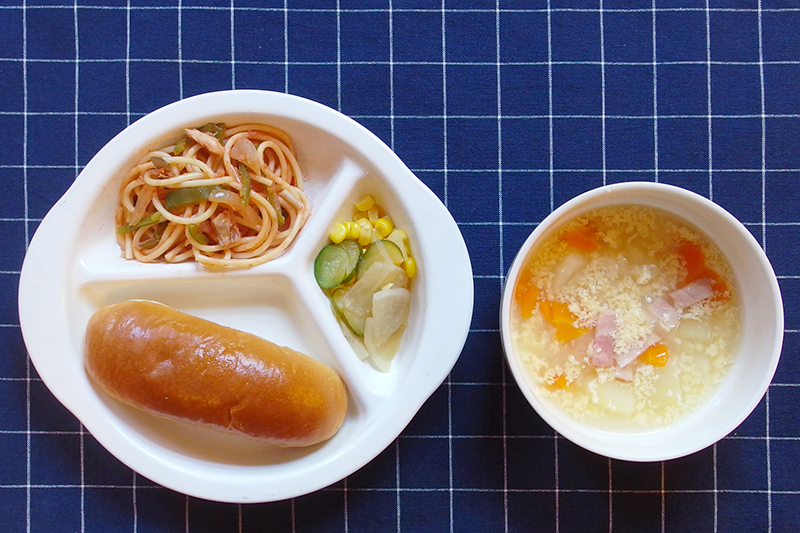 ロールパン ツナのナポリタンスパゲティ 野菜サラダ ふわふわスープ \ 9月18日 /