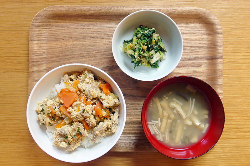 他人丼 ほうれん草と白菜のごま和え えのき茸のみそ汁 \ 9月22日 /
