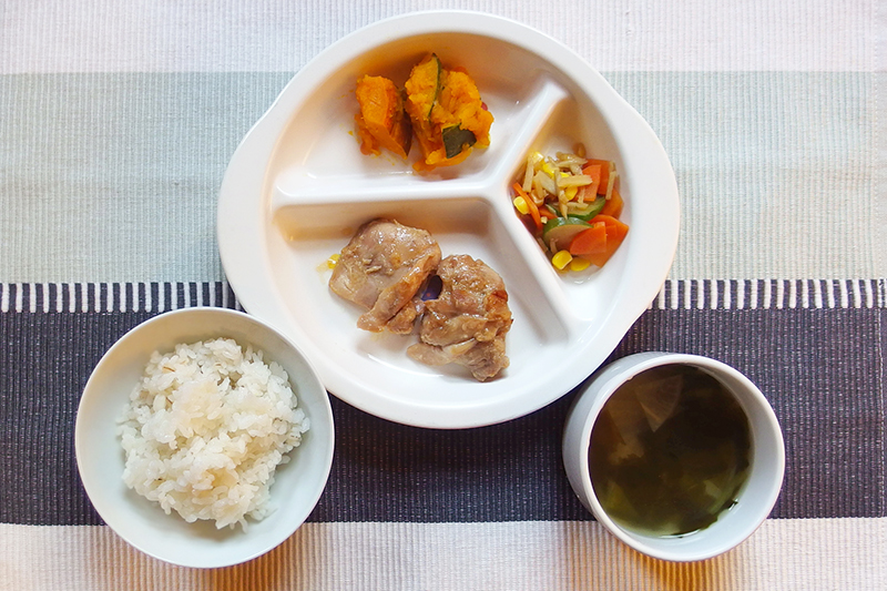 麦入りごはん 鶏肉のオイスターソース焼 かぼちゃの甘煮 中華サラダ 中華スープ \ 9月24日 /