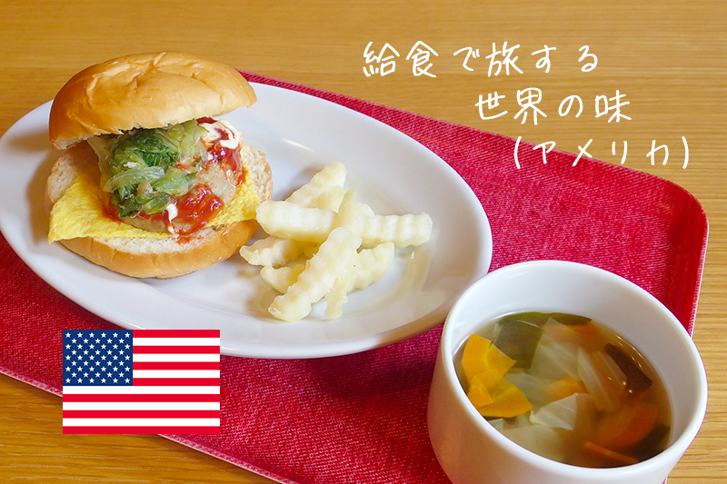 セルフハンバーガー(アメリカの料理) フライドポテト キャベツのスープ <ひとこと> 年長&年中児は具材を子どもたちが挟みました。 自分で作った特別な一品に、 にこにこ笑顔でかぶりついていました! \ 9月25日 /
