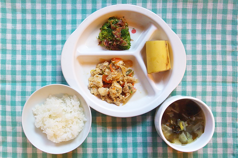 ごはん 炒り豆腐 ブロッコリーのおかか和え 白菜のみそ汁 フルーツ(バナナ) \ 9月29日 /