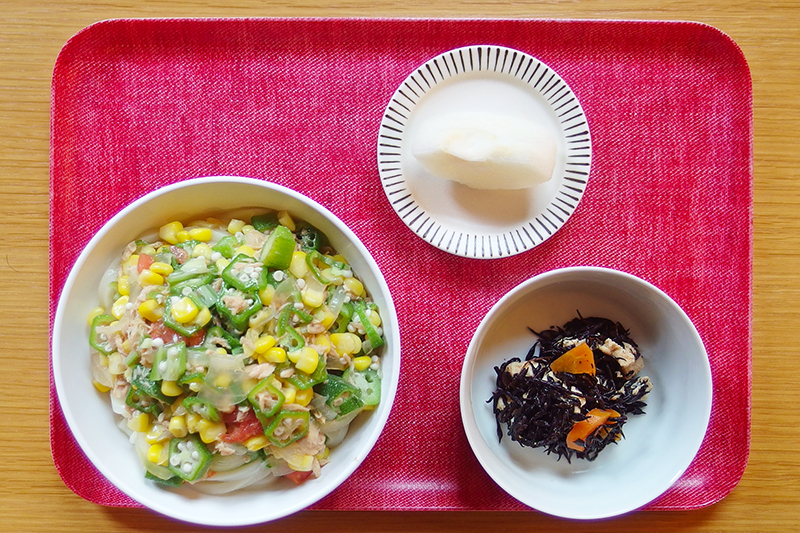サラダうどん ひじきと高野豆腐の煮物(海藻メニュー) フルーツ(梨) \ 9月3日 /