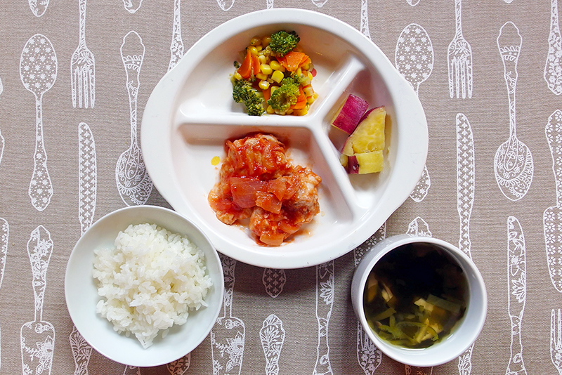 ごはん チキンソテートマトソース さつま芋の甘煮 ブロッコリーサラダ ピーマンのスープ \ 9月5日 /