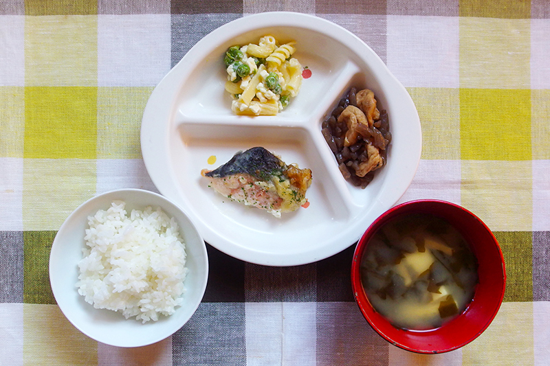 ごはん サケのバターソース マカロニサラダ がんもの煮物 豆腐の味噌汁 \ 1月9日 /