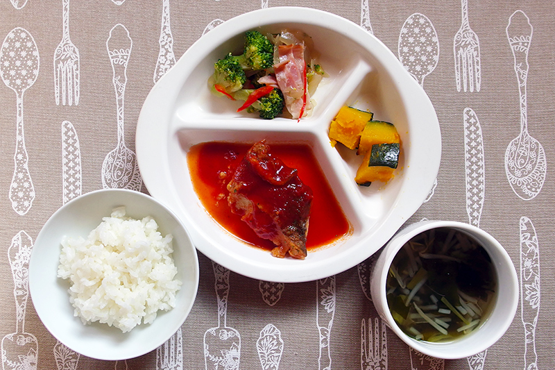 ごはん 白身魚のトマト煮 ベーコンとブロッコリーのソテー かぼちゃのガーリック焼 ピーマンのスープ \ 1月15日 /