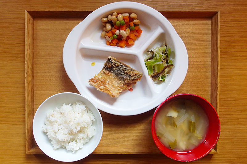 麦入りごはん さばの竜田揚げ キャベツともやしの塩昆布和え 煮豆 じゃがいものみそ汁 \ 1月20日 /