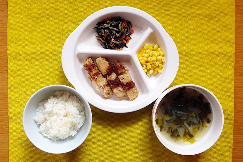 ごはん トンカツ(肩ロース) ひじき入り野菜炒め エリンギのスープ バターコーン \ 1月22日 /