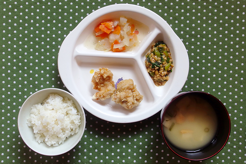 ごはん 鶏肉の塩唐揚げ チンゲン菜の納豆和え かぶのスープ煮 おつゆ麩のみそ汁 \ 1月23日 /