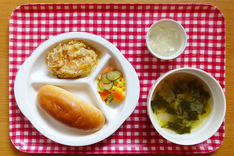 ロールパン 鶏肉とかぼちゃのグラタン 野菜サラダ えのきたけのスープ りんごかん \ 1月26日 /