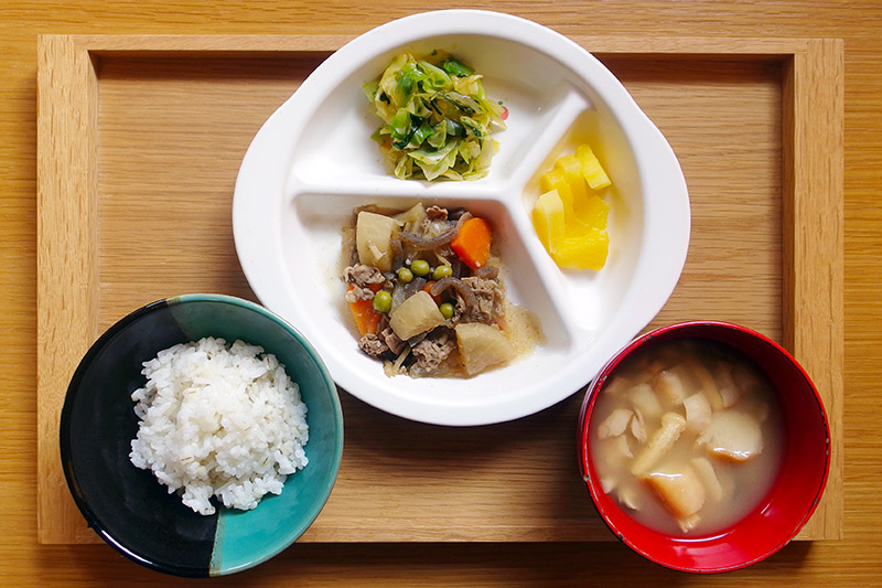 麦入りごはん 牛肉と根菜の煮物 キャベツとチンゲン菜のあおさ和え しめじのみそ汁 フルーツ(パイン) \ 1月27日 /