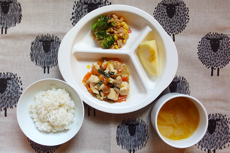 麦入りごはん ハオユー豆腐(オイスターソース煮込み) ツナサラダ 中華スープ フルーツ(りんご) \ 1月29日 /