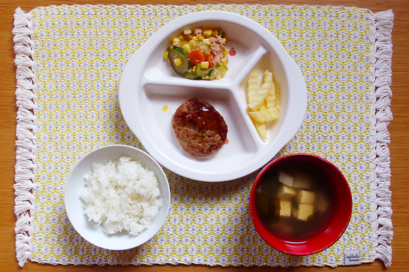 ごはん 照焼ハンバーグ ポテトフライ ツナサラダ 豆腐のスープ