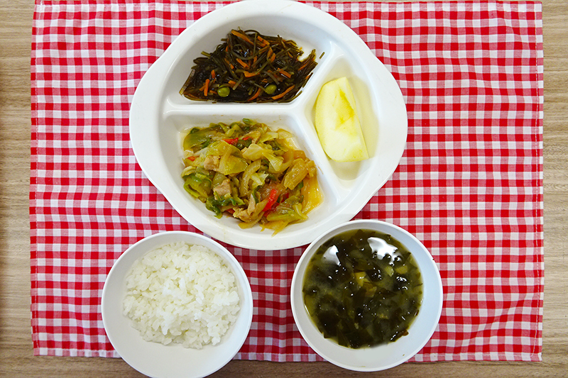 ごはん 鶏肉と野菜の甘酢炒め 細切昆布の煮物(海藻メニュー) ほうれん草のみそ汁 フルーツ(りんご) \ 1月5日 /