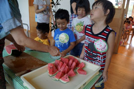 「お好きなスイカをどうぞ」「う〜ん、どれがおいしいかなあ」