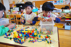 お友達と協力してきれいに積み木を積んだ年少さん。