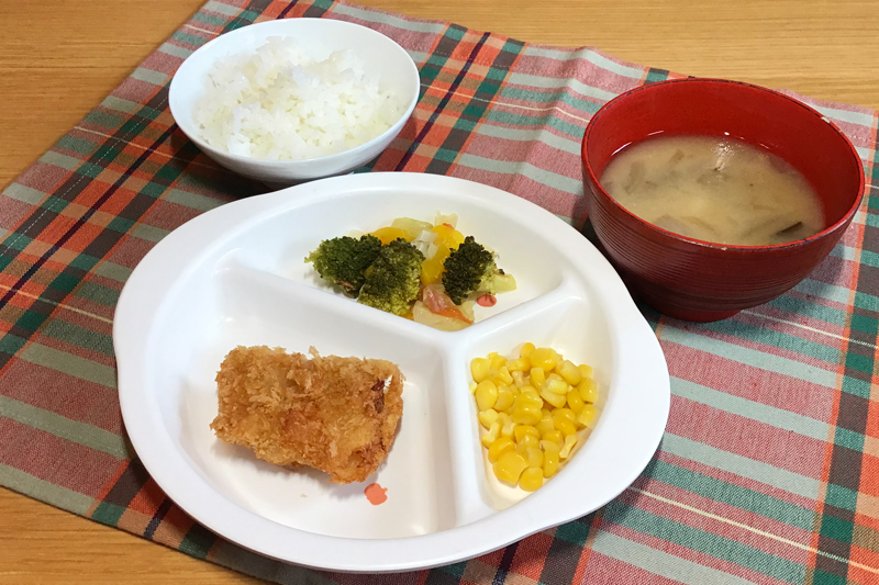 ごはん フィッシュフライ バターコーン 野菜サラダ なすびの味噌汁 \ 6月8日 /